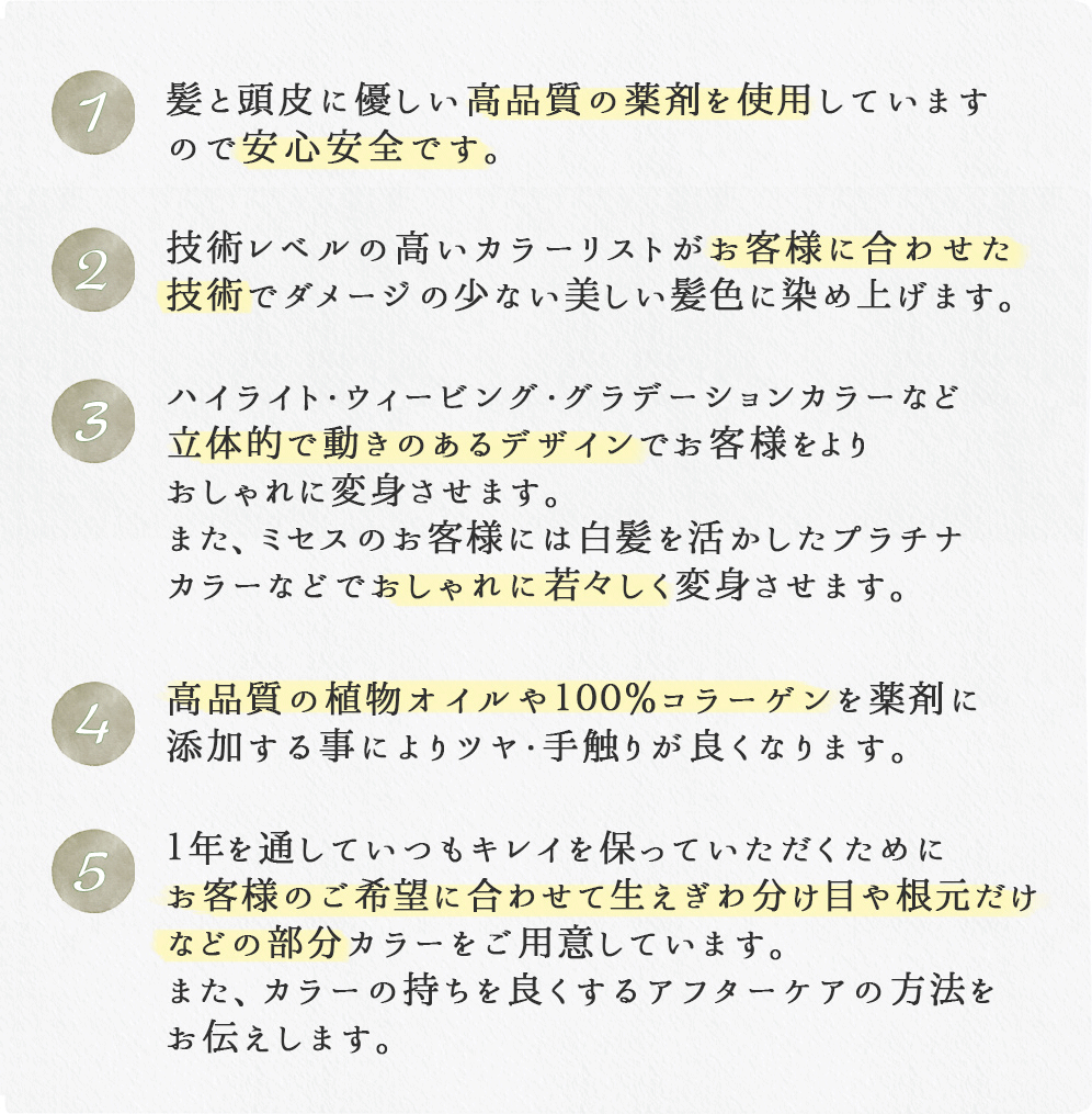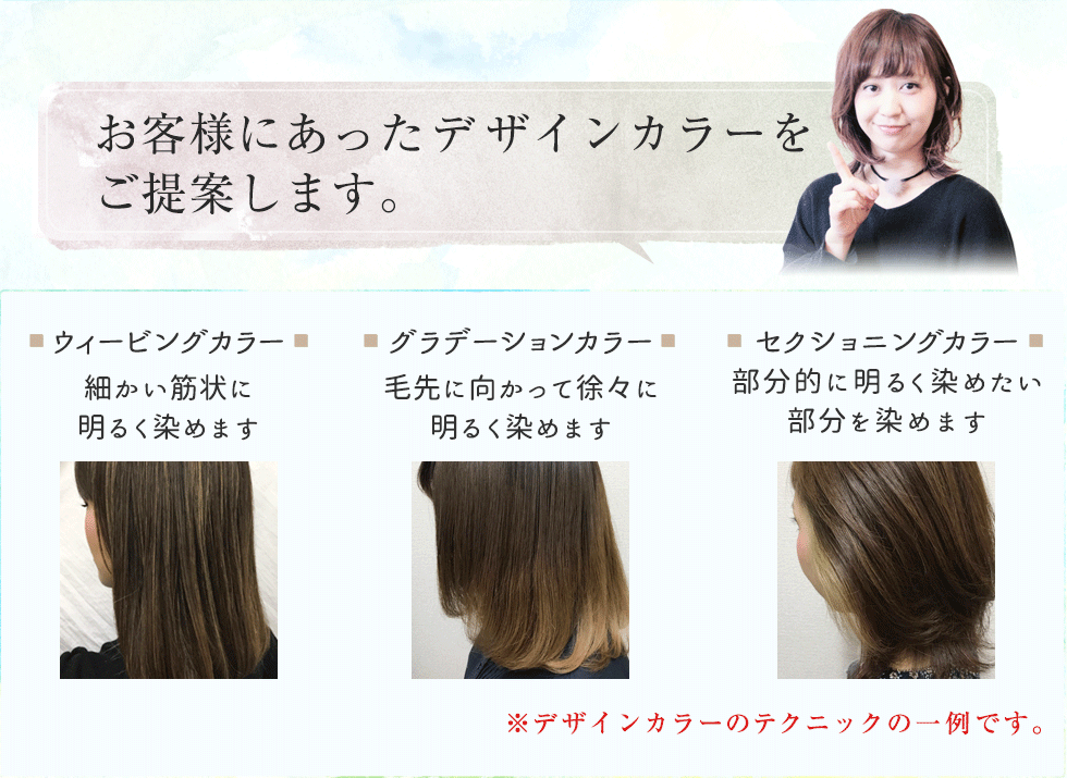 またお客様一人一人の根本~毛先の状況に合わせてカラー剤を伊郷氏、『塗り分け』・『作り分け』ができるので髪へのダメージも最小限に抑える事ができます。