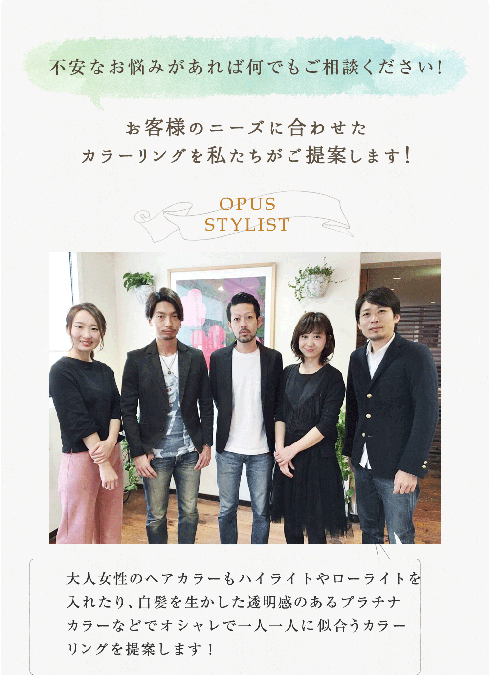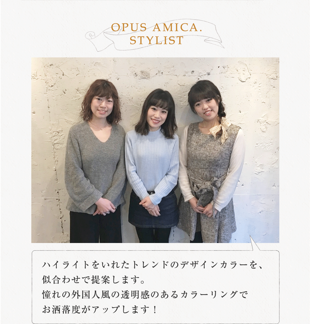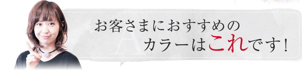 - A.お客様一人一人の髪質や地毛の色から薬剤選定をし、外国人風に染める方法を提案させていただきます。