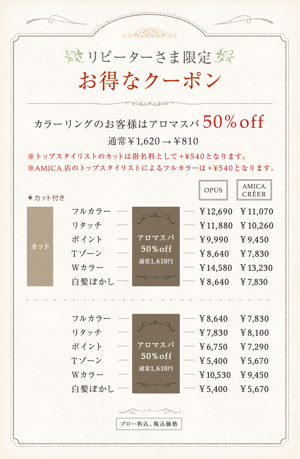 日、祝 カット10:00~18:00 カラーorパーマ10:00~17:00