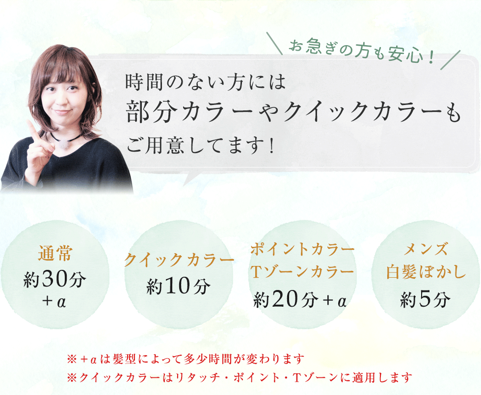 - 月~土 カット10:00~19:00 カラーorパーマ10:00~19:00