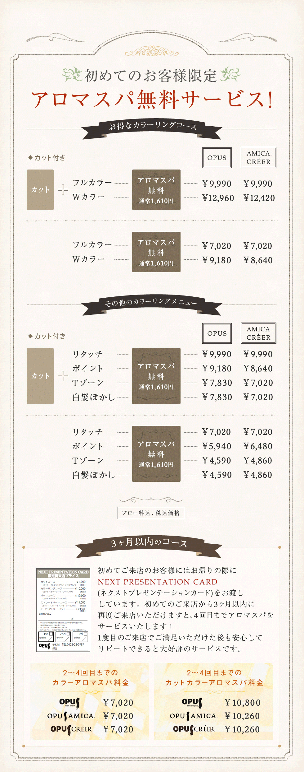 日、祝 カット10:00~18:00 カラーorパーマ10:00~17:00